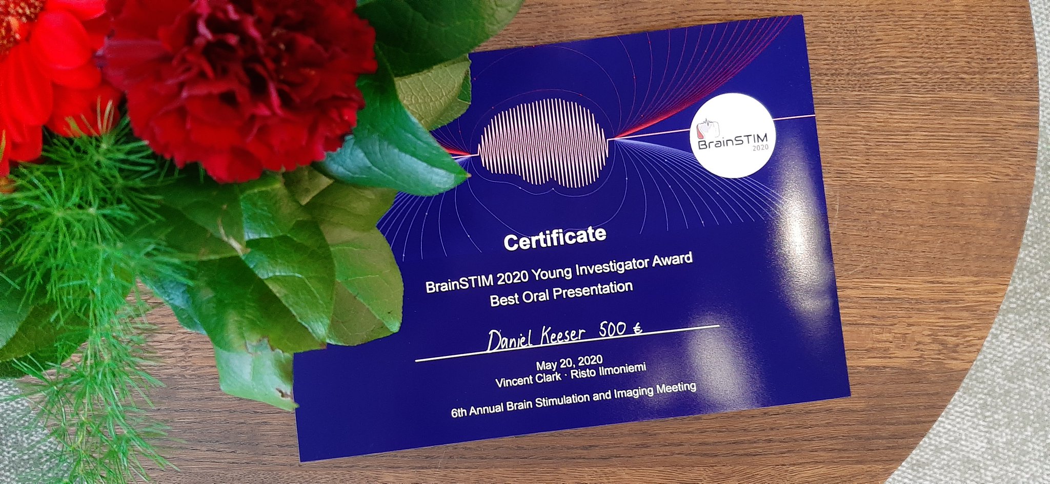 Twitter message: "The #BrainSTIM2020 Young Investigator Award (Best Oral Presentation) goes to Daniel Keeser! The jury considered that the presentation was of high scientific value and presented in an excellent way. Congratulations Daniel!" (https://twitter.com/BrainSTIM2020/status/1263148558817071105)